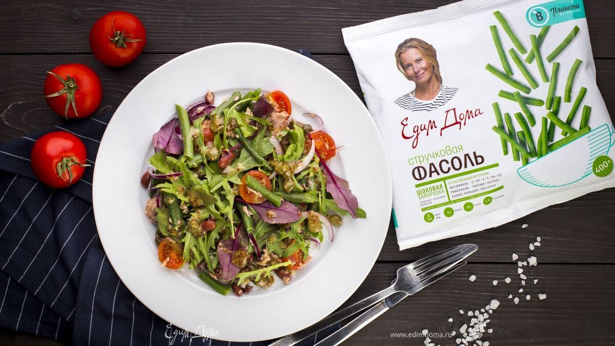 Соедините в салатнике зеленую и красную фасоль, листья салата, помидоры черри и лук. Сверху разложите кусочки тунца. - Шаг 8