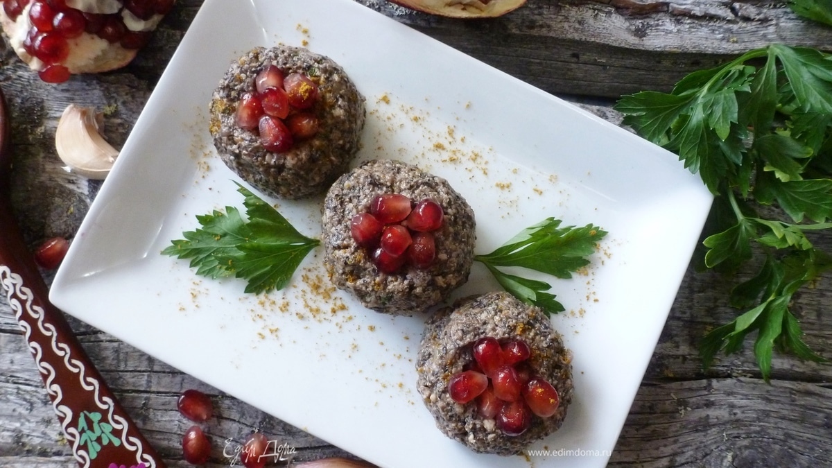Скатать из орехово-грибной массы шарики размером с грецкий орех, сверху сделать ямку и в нее положить зерна граната. - Шаг 6
