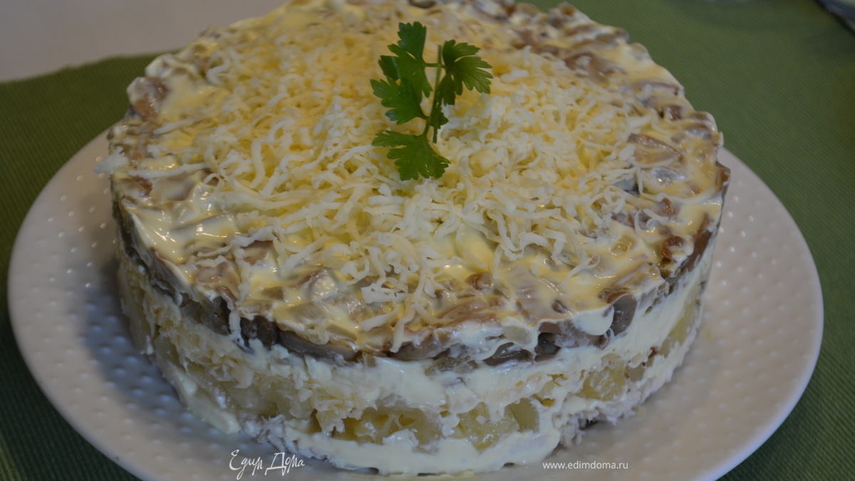 И последний слой — грибы с луком. С грибов слить жидкость. Положить в разогретую сковороду с растительным маслом грибы и лук, нарезанные кубиками. Обжарить в течение 20 минут на медленном огне, периодически помешивая. Остудить и выложить на сыр. Смазать майонезом. Убрать в холодильник, чтобы салат настоялся. Перед подачей снять форму, сверху посыпать тертым сыром.