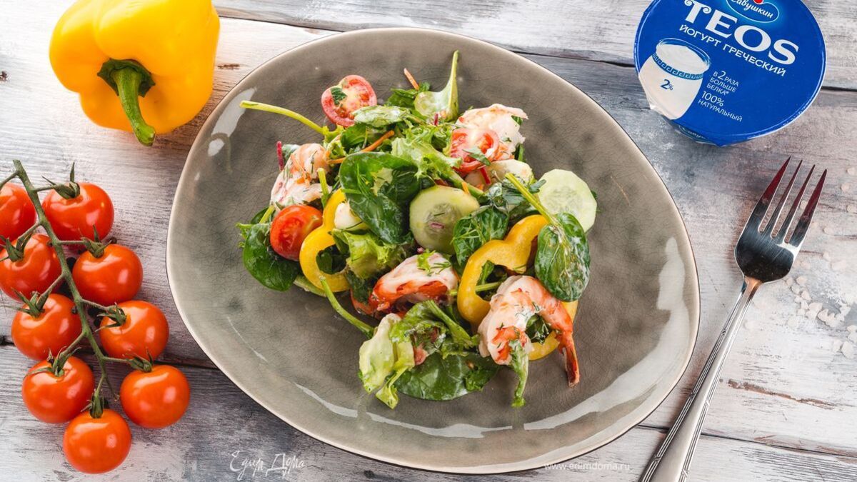 Салат с креветками и заправкой из йогурта