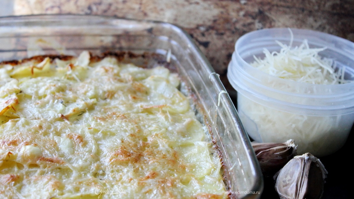 - Шаг 2В форму для запекания выкладывать слоями картофель, посыпая чесноком, сыром, ароматными специями (тимьян, мускатный орех или просто свежемолотый перец) и поливая сливками. Каждый слой слегка посолить.