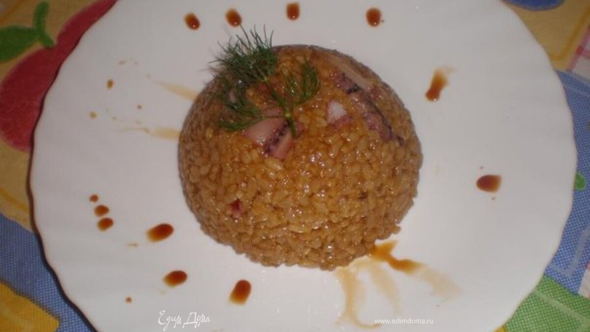 - Шаг 1рис отварить с расчетом - на 1 стакан риса 2 стакана воды, морепродукты обжарить в сковороде на подсолнечном масле,обжаривать до тех пор,пока не выпарится жидкость; в отдельной сковороде обжарить до золотистого цвета мелко нарезаный чеснок,добавить рис и залить соевым соусом,перемешать до образования золотисто-коричневого цвета; на дно пиалки или небольшой,глубокой мисочки (обмазаной кусочком сливочного масла) положить немного морепродуктов - сверху рис - опять чуть морепродуктов и потом до краев опять рис; под пиалку подставить большую тарелку,перевернуть. Приятного аппетита!