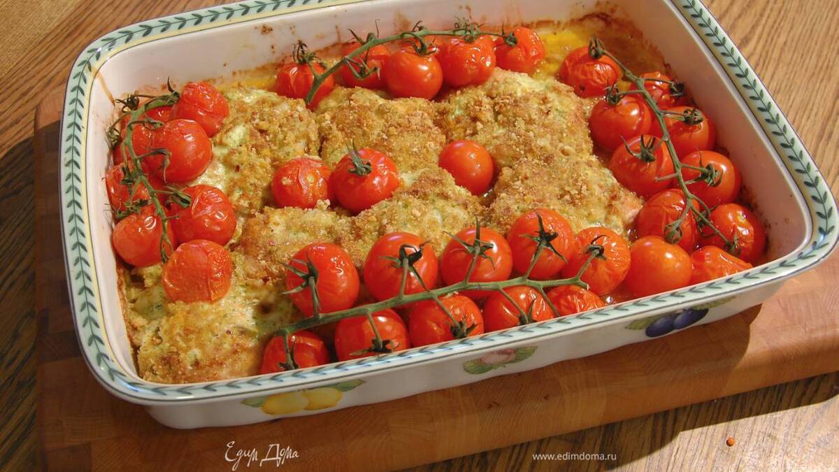 Запекать курицу в разогретой духовке 20 минут, затем добавить в форму помидоры на веточках и запекать все до готовности.