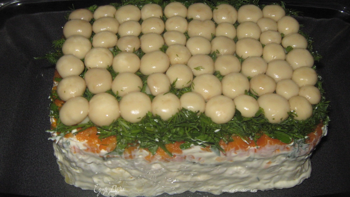 - Шаг 1Берём большой глубокий салатник(или любимую форму), выстилаем его пищевой пленкой и начинаем выкладывать салат слоями в следующей последовательности: целые грибы шляпками вниз, вся измельченная зелень, натертая на терке морковь; майонез. слой нарезанного мелкими кубиками куриного мяса, майонез, нарезанный тонкими кружочками огурец нарубленые яйца, майонез, натёртый на крупной терке картофель майонез убираем час на 3-4 в холодильник перед подачей накрываем салатник блюдом, переворачиваем салат и получаем куличик