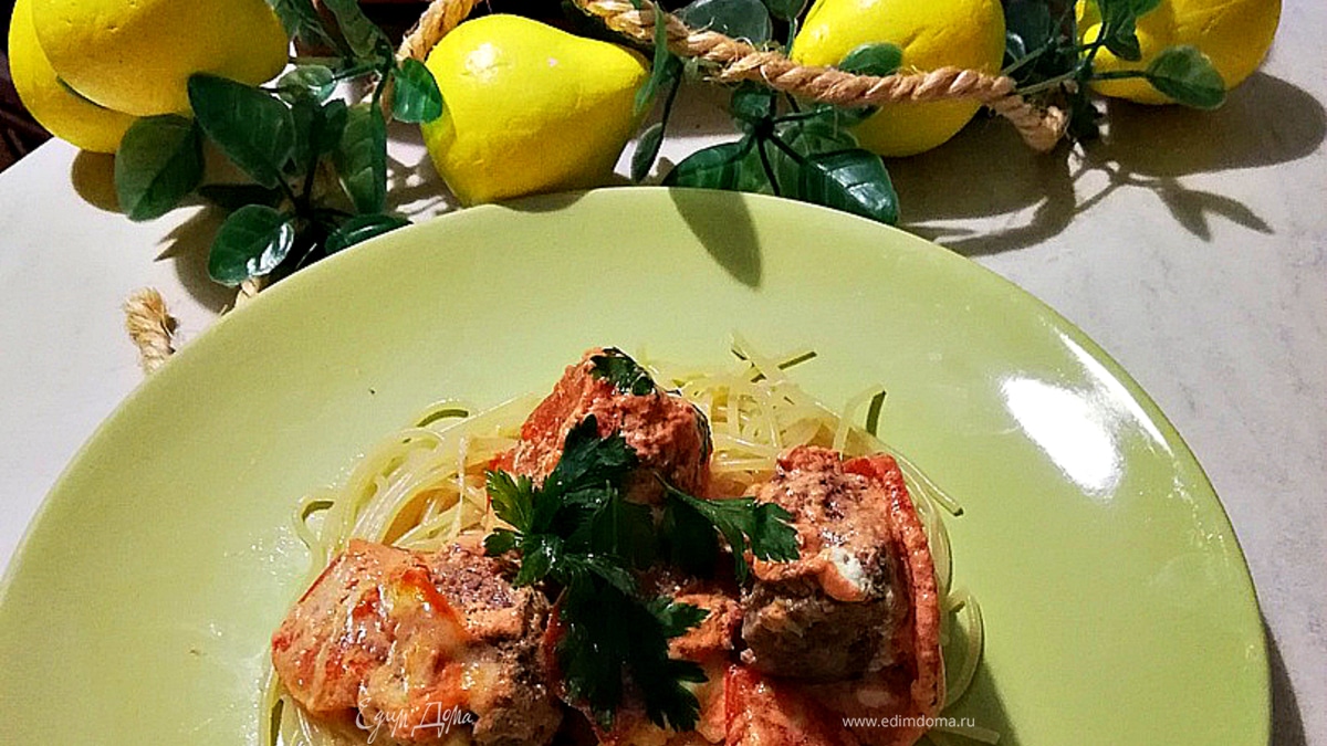 Базилик и петрушку рубим мелко и посыпаем горячие тефтели. На гарнир можно подать спагетти или любые другие макароны. Приятного аппетита!