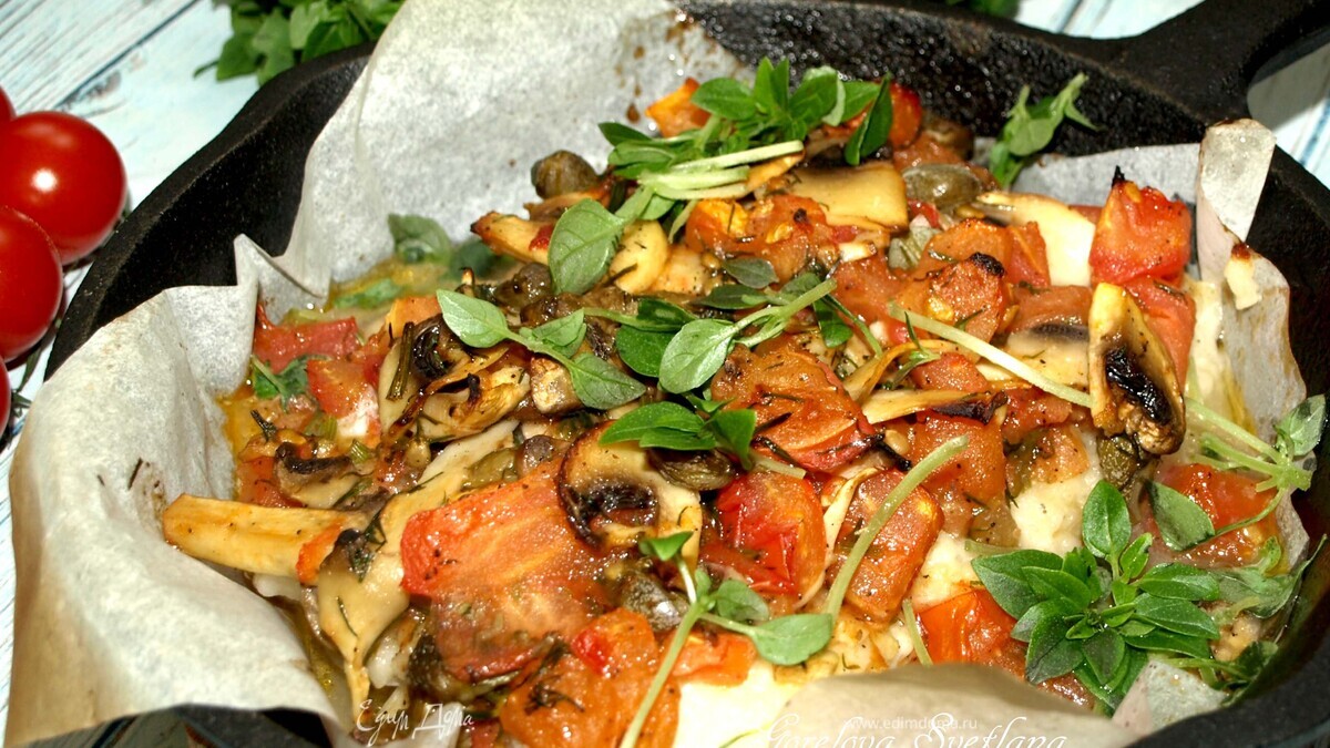 Треска, запеченная с помидорами и грибами
