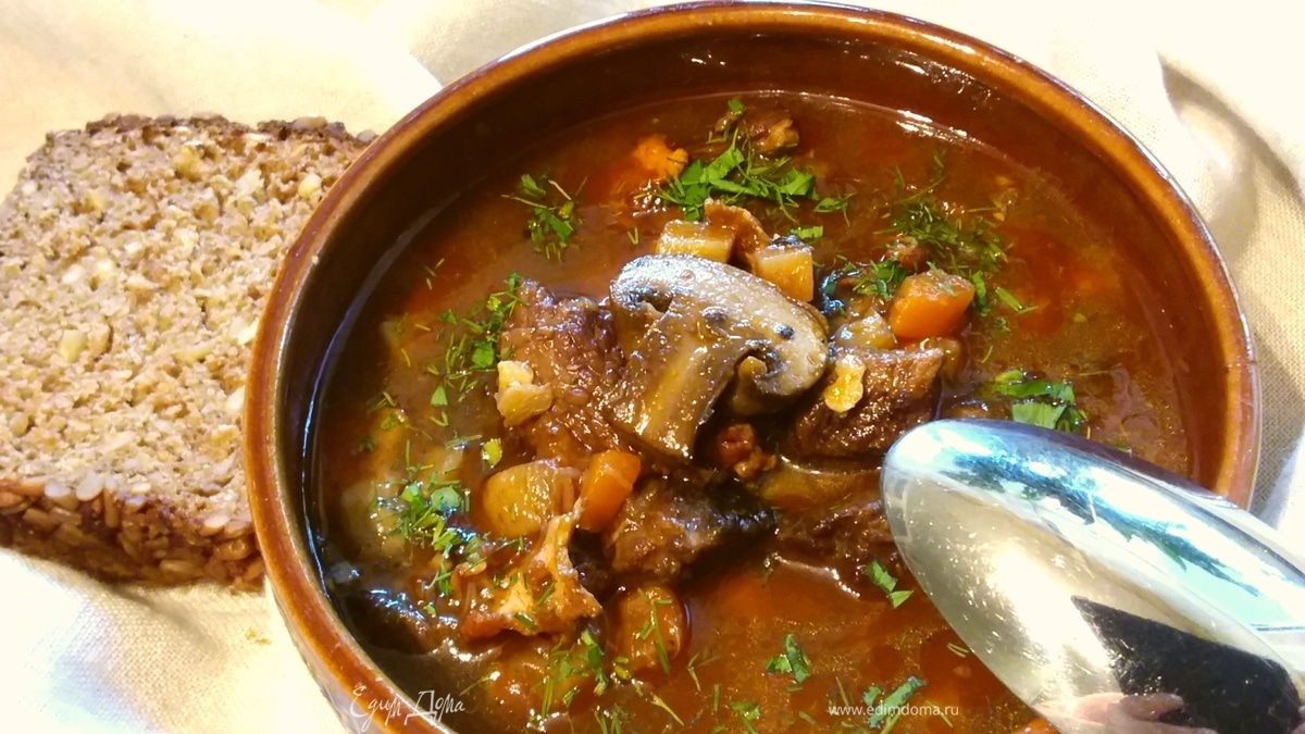 Когда мясо будет готово (время варки зависит от мяса), выложить в суп бекон и шампиньоны, варить 20 минут. Довести до вкуса (посолить и поперчить, по желанию можно добавить хлопья перца чили и щепотку сахара). Вынуть веточки тимьяна и лавровый лист. - Шаг 7