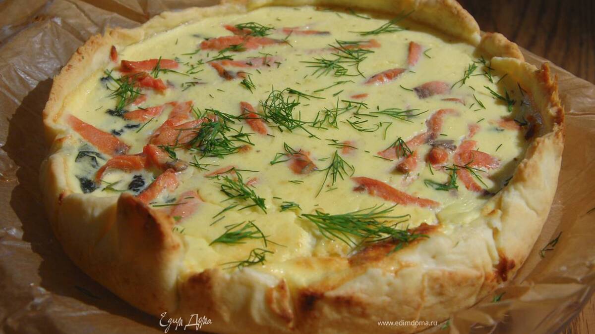 Киш с копченой рыбой, шпинатом и хреном