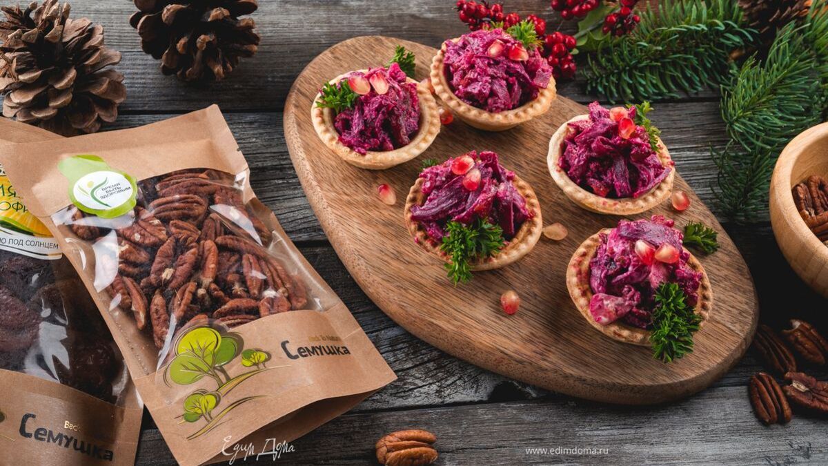 Салат из свеклы, пекана и красной сливы в тарталетках
