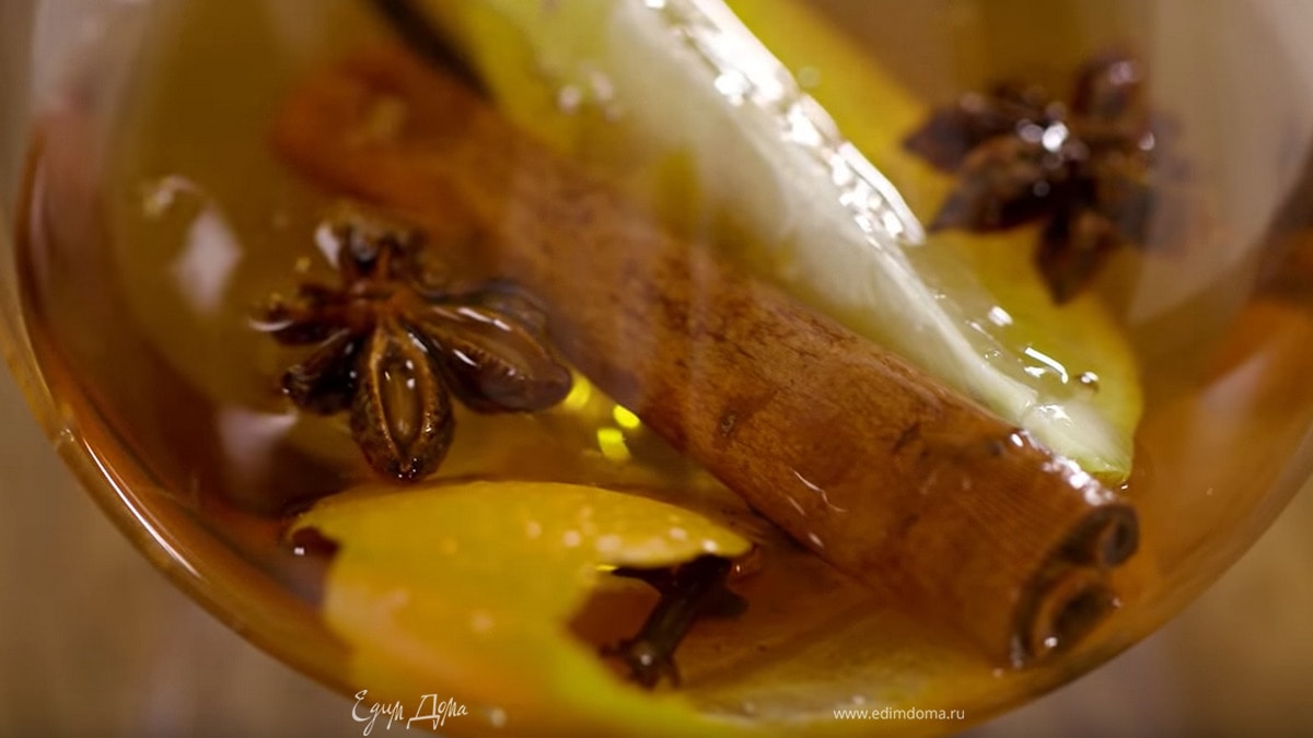 В бокал выложить четвертинку лимона, цедру апельсина, корицу, бадьян, ваниль и гвоздику, влить ром, а затем свежезаваренный чай.