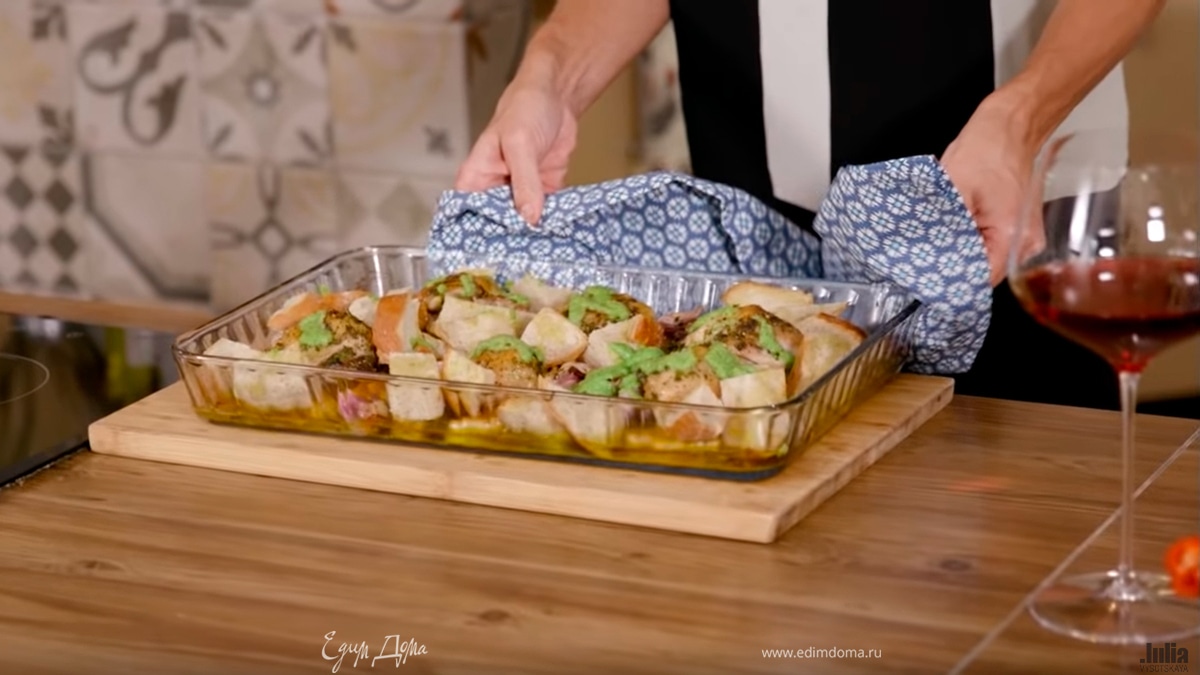 Когда курица будет почти готова, вынуть форму из духовки, добавить в нее нарезанный хлеб и песто, полить все оставшимся оливковым маслом и запекать еще 2‒3 минуты.