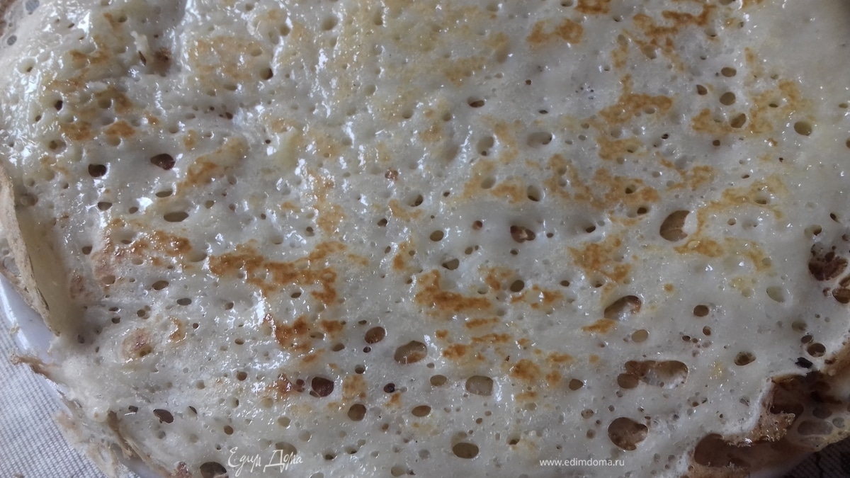 Разогреваем сковороду. Смазываем маслом, чтобы первый блин получился хорошо и не прилип. Наливаем половником тесто на сковороду тонким слоем, выпекаем блинчики. - Шаг 3