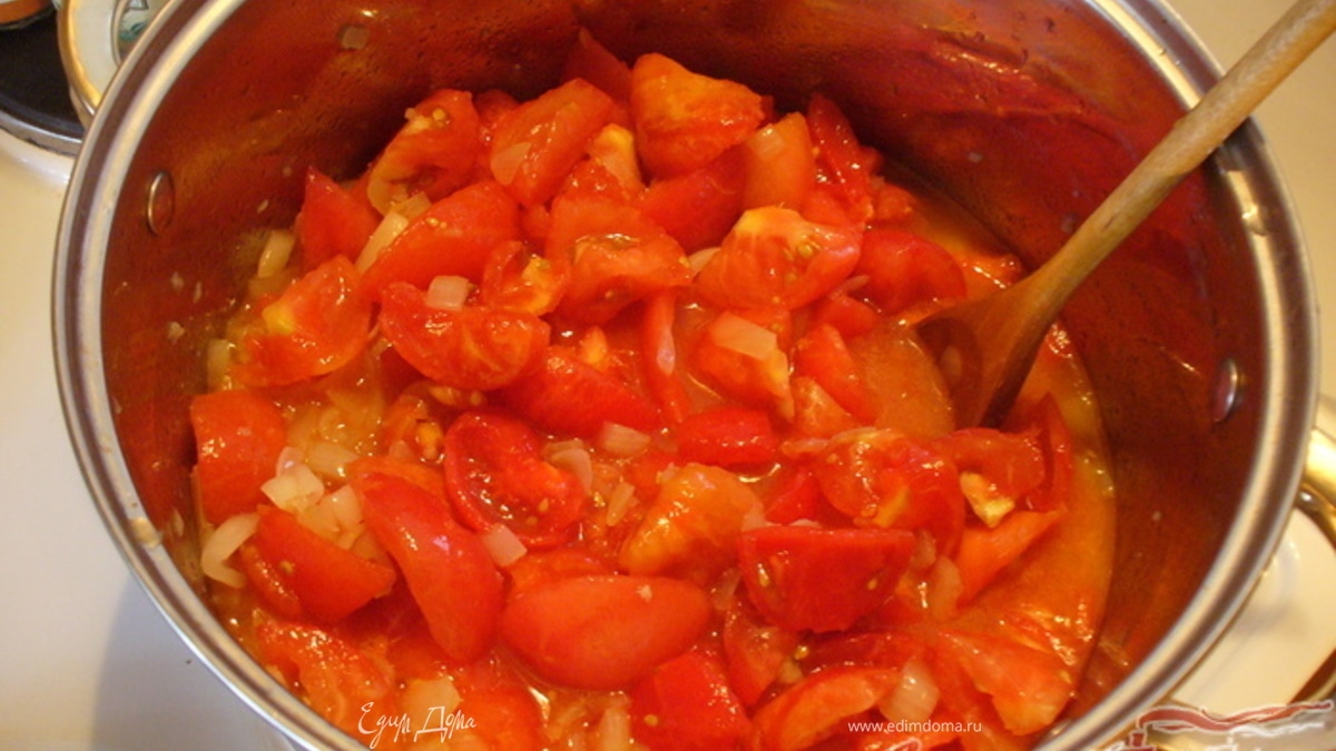 В кастрюле разогреть масло, обжарить до прозрачности лук с чесноком, отправить туда же помидоры. Перемешать, посолить, поперчить, кинуть базилик. Закрыть крышкой и тушить на маленьком огне минут 20. - Шаг 4