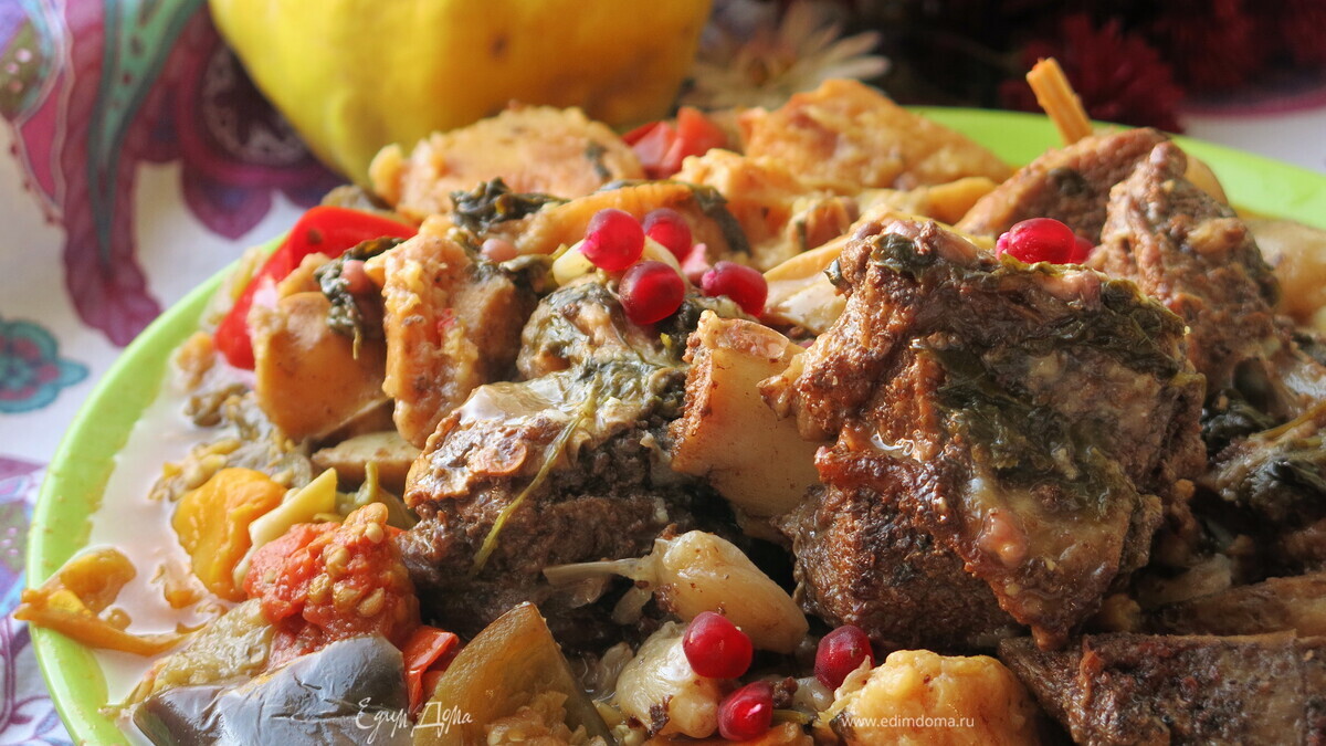 Осенний вариант рагу — ребрышки телячьи с айвой и зернами граната. Рекомендую подавать с тушеными овощами. Приятного!