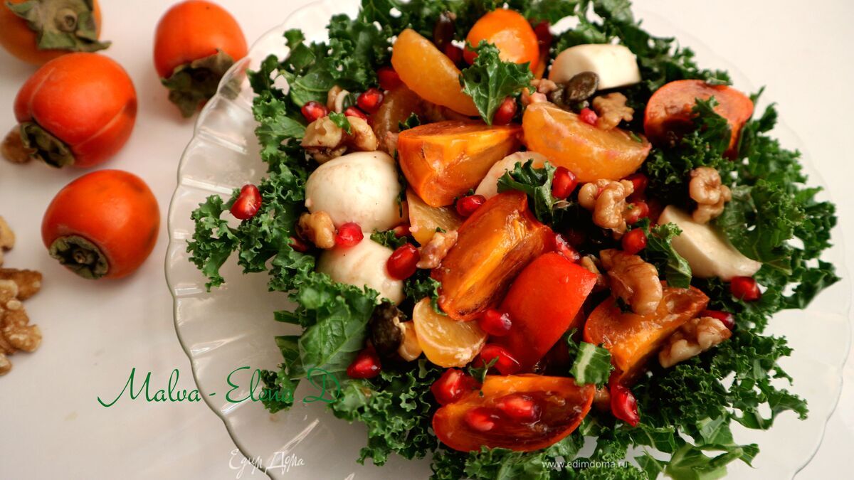 Осень богата яркими красками. Такой салат на вашем столе, думаю, будет смотреться весьма симпатично. Оранжевые мандарины и хурма, ярко-красный гранат, зеленая кудрявая капуста кале, темно-оливковые