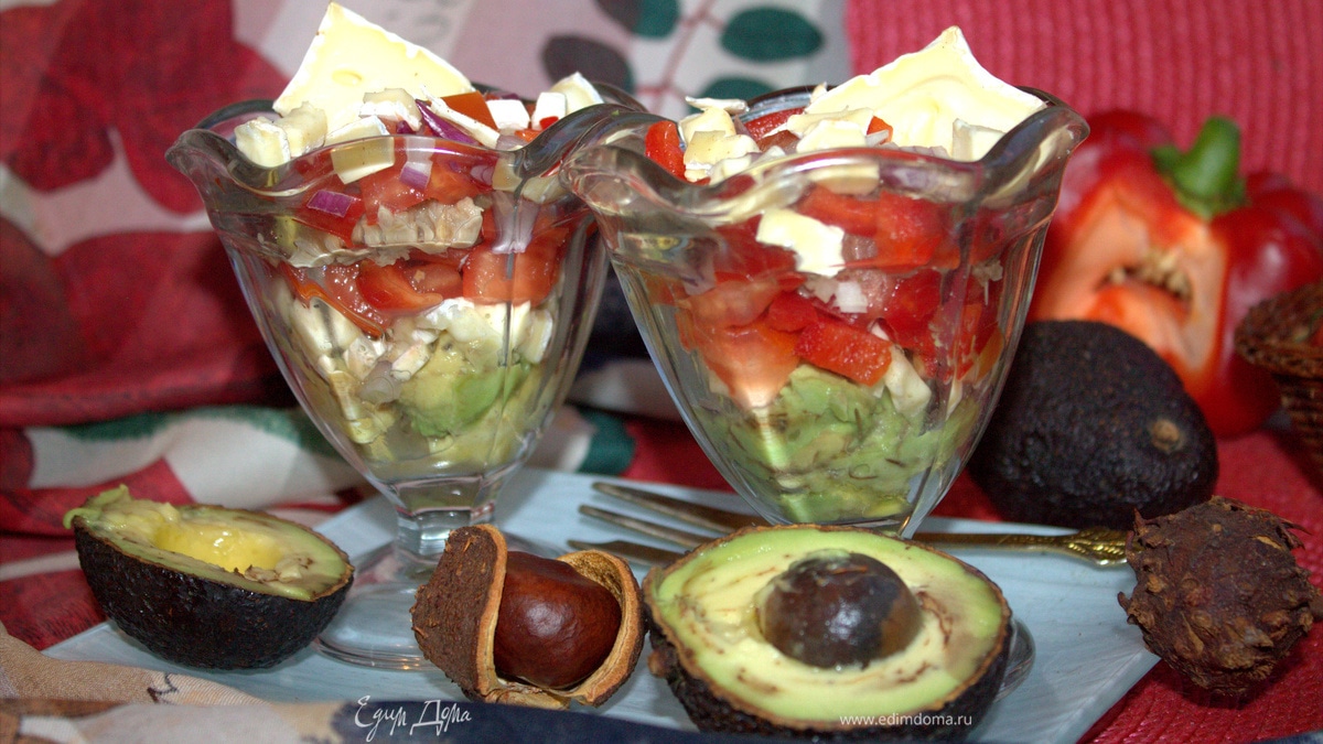 Простой салатик. Нашла у СНежк_а, от себя добавила сладкий перец и сыр бри. Можно все перемешать, если авокадо позволяет себя нарезать. Но красиво будет смотреться слоями, даже если готовите просто для себя. Автор предлагает делать с майонезом, но мне достаточно было добавить чуть-чуть оливкового масла.