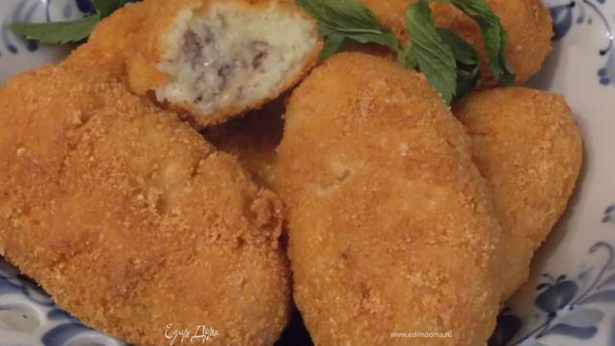 Соединяем края лепешки и скатываем зразу овальной формы. Обваливаем в муке. Для панировки разбиваем яйцо и взбалтываем его вилкой, в отдельную посуду насыпаем панировочные сухари. - Шаг 5