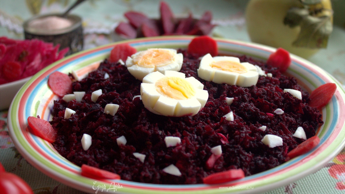 Не праздничное блюдо, но на закуску перед обедом или ужином подойдет. Если смазать слои майонезом, получится имитация «шубы». Если нравится постный вариант — сбрызнуть слои оливковым маслом. Можно дать настояться в холодильнике, заодно охладить.