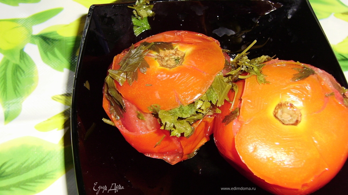 - ПодготовкаДля начала вымыть помидоры и надрезать верхушку, после чего нарезать зелень и смешать ее с порезанным чесноком и черным перцем горошком, нафаршировать этим помидоры.Далее взять небольшую, желательно широкую кастрюлю, на дно которой положить 4-5 зонтиков сухого укропа и разрезанный пополам красный перец. Уложить помидоры на дно кастрюли. И залить горячим рассолом, из расчета 3 столовые ложки соли на 1 столовую ложку сахара. Дать рассолу остыть и накрыв крышкой с гнетом, поставить в холодильник. Через пару дней помидорчики готовы. Получается кисленько и остренько.