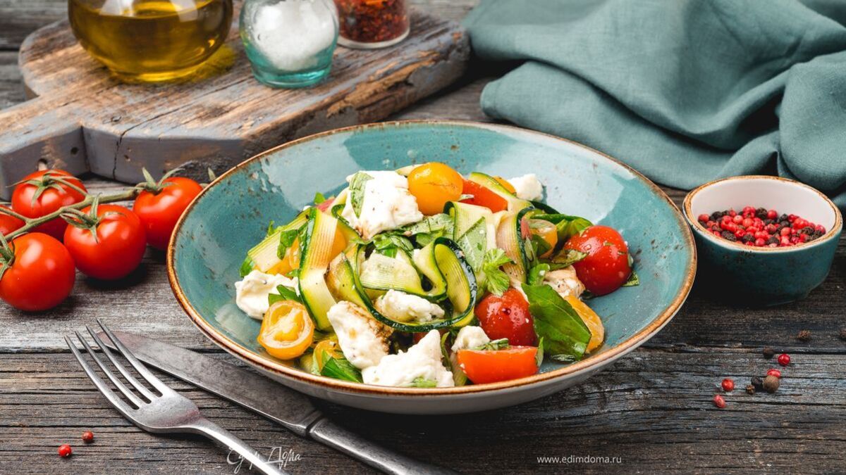 Соедините в салатнике маринованные цукини, томаты, моцареллу и базилик, заправьте все бальзамическим уксусом и перемешайте. - Шаг 6