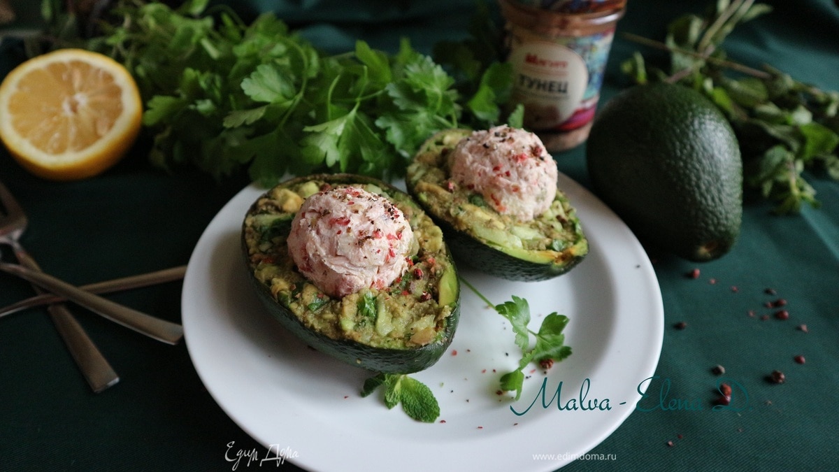 Смазать ладони оливковым маслом. Скатать из рыбной начинки шарики, по размеру равные косточке от авокадо. Положить начинку в центр половинок авокадо. - Шаг 8