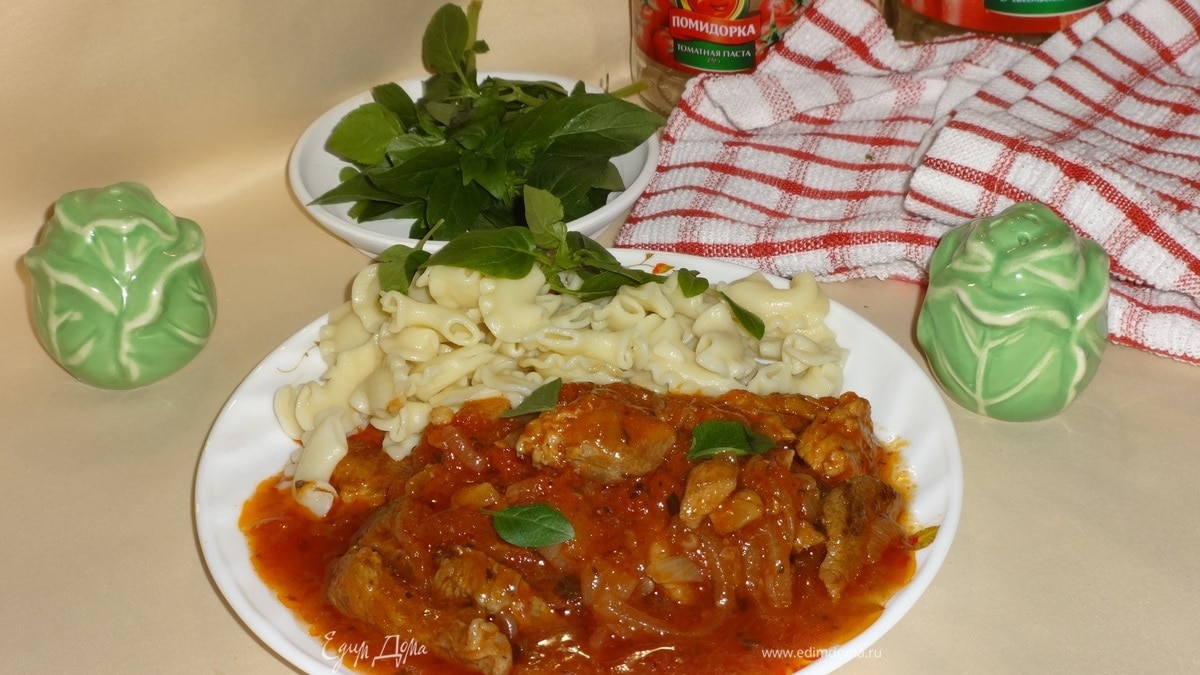Предлагаю вашему вниманию очень вкусное блюдо в итальянском стиле. Мясо получается сочным и ароматным. Для соуса я использовала помидоры в собственном соку и томатную пасту ТМ «Помидорка». Блюдо отлично сочетается с любыми видами пасты, также на гарнир можно подать рис или картофельное пюре. Угощайтесь!