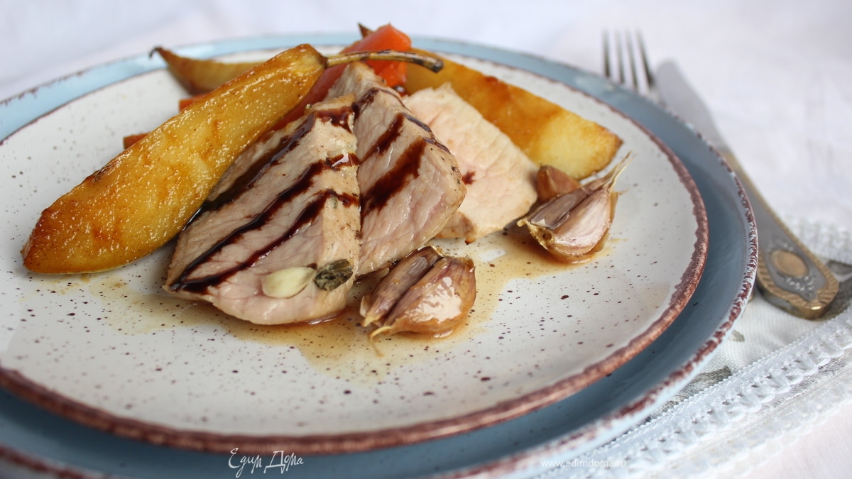 Ароматная свинина, нашпигованная шалфеем и чесноком, запеченная в медовом соусе, прекрасно гармонирует с гарниром из глазированных мягкой груши и хрустящей моркови.