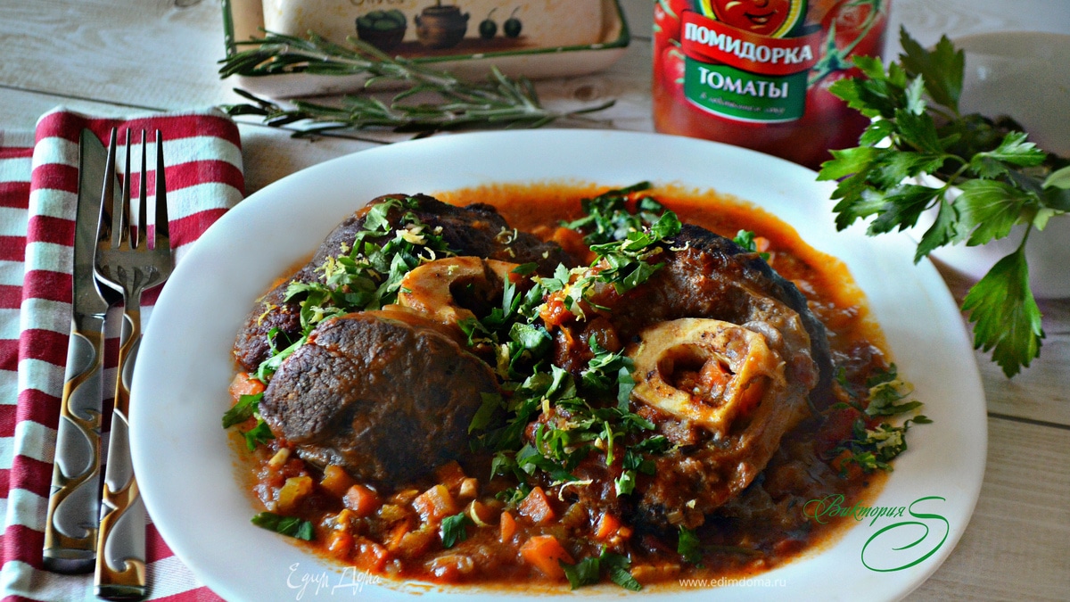 Оссобуко (по-русски — голяшка) — весьма популярное итальянское блюдо региона Ломбардия. Для его приготовления используется говядина (телятина), а именно голяшка — верхняя часть ноги, которая распиливается на куски-стейки толщиной 3–4 см вместе с костью. Поэтому и переводится с итальянского как «полая кость». Именно эта кость придает блюду особые вкус и аромат, а пленка, обволакивающая мясо, не срезается, сохраняя все соки, что во время долгого тушения с овощами делает мясо необыкновенно нежным и сочным, напитанным ароматами. Конечно же, это блюдо не на каждый день, оно требует долгого приготовления, но, поверьте, оно того стоит! Это действительно невероятно вкусно! С наступлением холодов оно особенно актуально! Очень вам рекомендую приготовить!