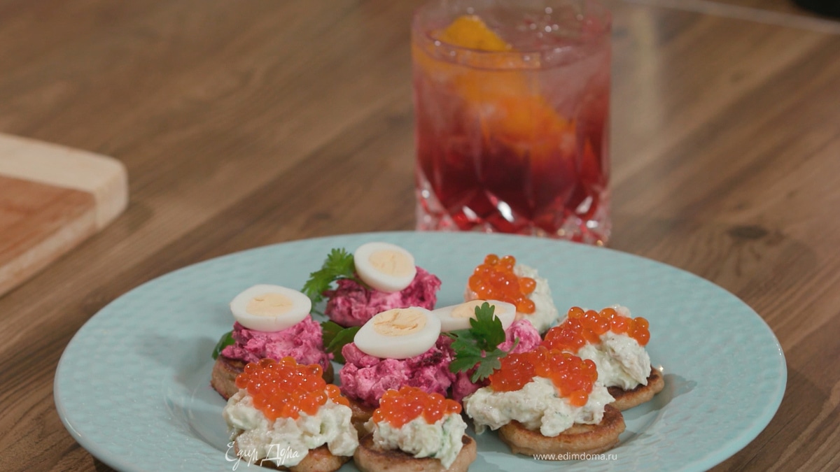 Разогреть в сковороде оливковое и оставшееся сливочное масло и пожарить из теста маленькие блинчики или оладушки, на часть из них выложить свекольный топинг и половинки вареных яиц, на остальные —топинг из огурца и икру. - Шаг 8