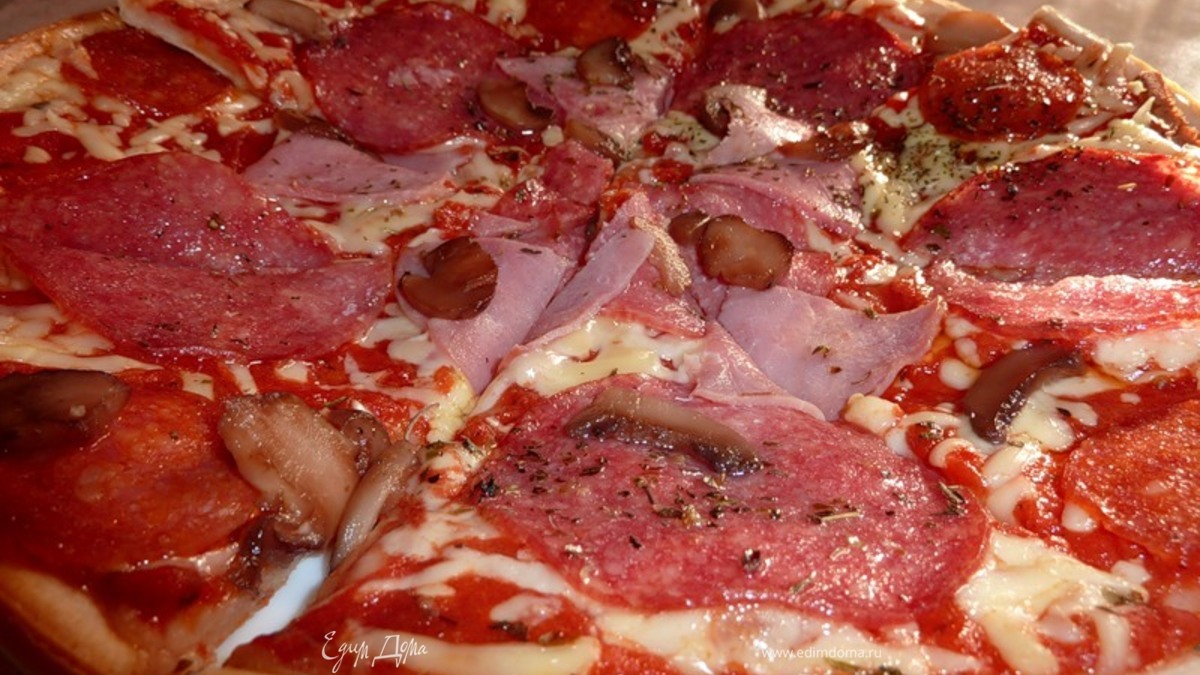 - Шаг 1Тесто делаю такое же как и на булочки (см. мой рецепт "Дрожжевые булочки"). Раскатываю тесто тонко и смазываю олив. маслом. В маленькой мисочке на газу распариваю таматную пасту (добавив в неё немного воды) с сушёной травкой "Орегано", добавляю по вкусу соль и сахар. Смазываю тесто при помощи кисточки с резиновыми пальчиками, посыпаю тёртым твёрдым сыром, укладываю порезанную салями, ветчину, жареные шампиньоны и "Орегано", выпекаю. Приятного аппетита!
