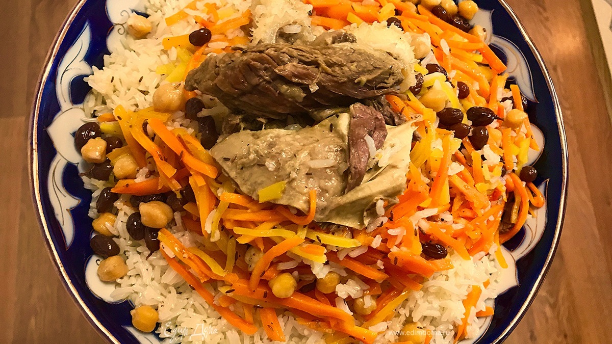 Промыть кастрюлю/котел и заложить в него слой морковки, нарезанной мелко соломкой 2х2 миллиметра, далее заложить мясо, добавить специи, хумус, если хотите, и обязательно изюм. Сверху кладем оставшуюся морковь, также можно добавить кусочки курдюка, утрамбовать немного и залить бульон так, чтобы он покрыл примерно слой мяса, но не доходил до верхнего слоя морковки. Включить огонь и дать закипеть, далее сделать огонь потише и томить на медленном огне примерно 25 минут. Далее выложить на слой морковки подготовленный слегка отваренный рис, посыпать зирой, разровнять. Сделать огонь на максимум и начать выпаривать бульон, примерно через 3–5 минут, сделать много отверстий в рисе до дна котла/кастрюли (в это время можно влить раствор шафрана на рис), и примерно, когда бульона останется на дне не так много (в этом плове всю жидкость выпаривать не нужно!), закрыть крышкой, сделать огонь на минимум и ждать 15 минут примерно. В это время нужно налить в разогретую сковородку/казан растительное масло, лучше смесь хлопкового и кунжутного и максимально нагреть, забросить целую луковицу и обжарить ее дочерна, затем выбросить. Когда рис будет готов, нужно открыть крышку и вылить равномерно, распределив раскаленные масло на слой риса, сразу закрыть крышку обратно и подождать еще 5 минут. Плов готов. - Шаг 4