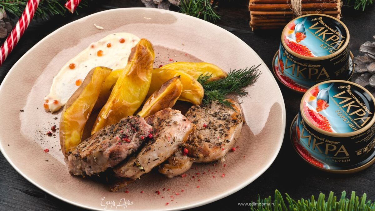 Свинина под сливочным соусом с красной икрой