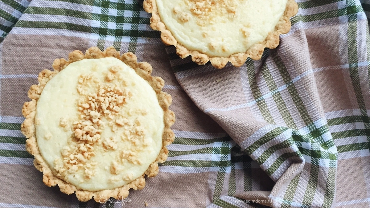 Достать тесто. Разделить на части, равные количеству формочек. Формочки заполнить тестом равномерно, затем на 3/4 залить кремом. Посыпать крошкой из теста и отправить в разогретую до 200°C духовку на 20 минут. Приятного аппетита!