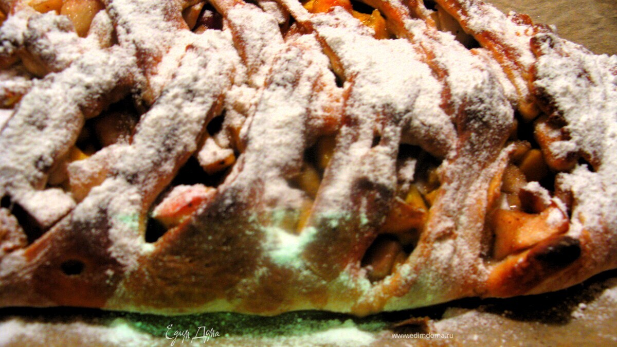 Раскатываем первое тесто в шар потолще, выкладываем начинку, надрезаем края и плетем плетеночку)