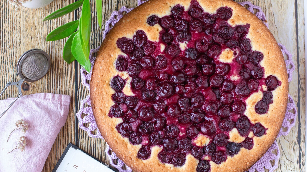Распределить ягоды по поверхности теста, немного не доходя до края формы, чтобы при выпекании сок от вишни не попадал на горячую форму и не пригорал. Отправить в разогретую до 180°C духовку на 30–35 минут. - Шаг 7