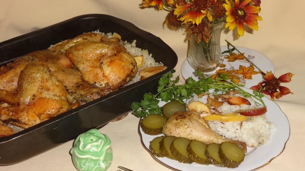 Курица на рисовой подушке с яблоками и айвой