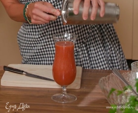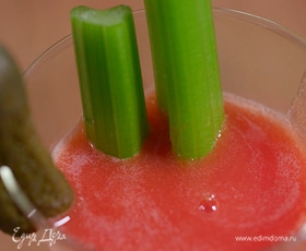 Коктейль перелить через сито в высокий бокал, на его край надеть корнишон, в напиток опустить разрезанный стебель сельдерея.