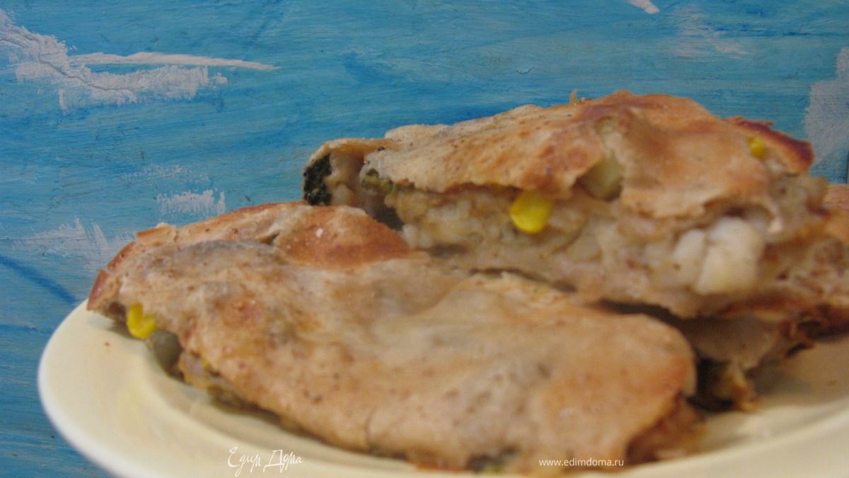 Смазываем слой томатным соусом, добавляем спаржу, кукурузу, капусту, хорошенько поливаем соусом и накрываем тестом, предварительно проткнув его вилкой. - Шаг 6