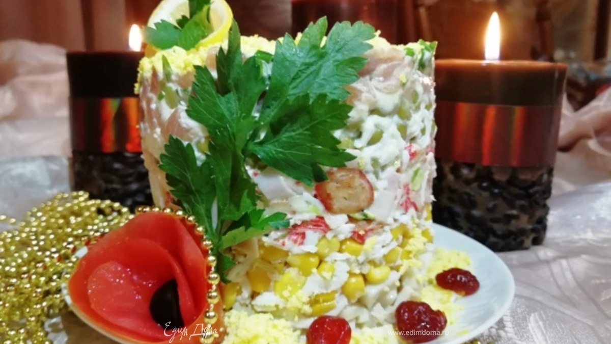 Приближаются долгожданные новогодние праздники. Конечно, ни один стол не обходится без салатов. В этот раз я не стала добавлять рис или картофель, захотелось, чтобы салат был более легким. А с кукурузой и зеленым горошком ТМ «Фрау Марта» мой салат получился ярким и по-настоящему праздничным.