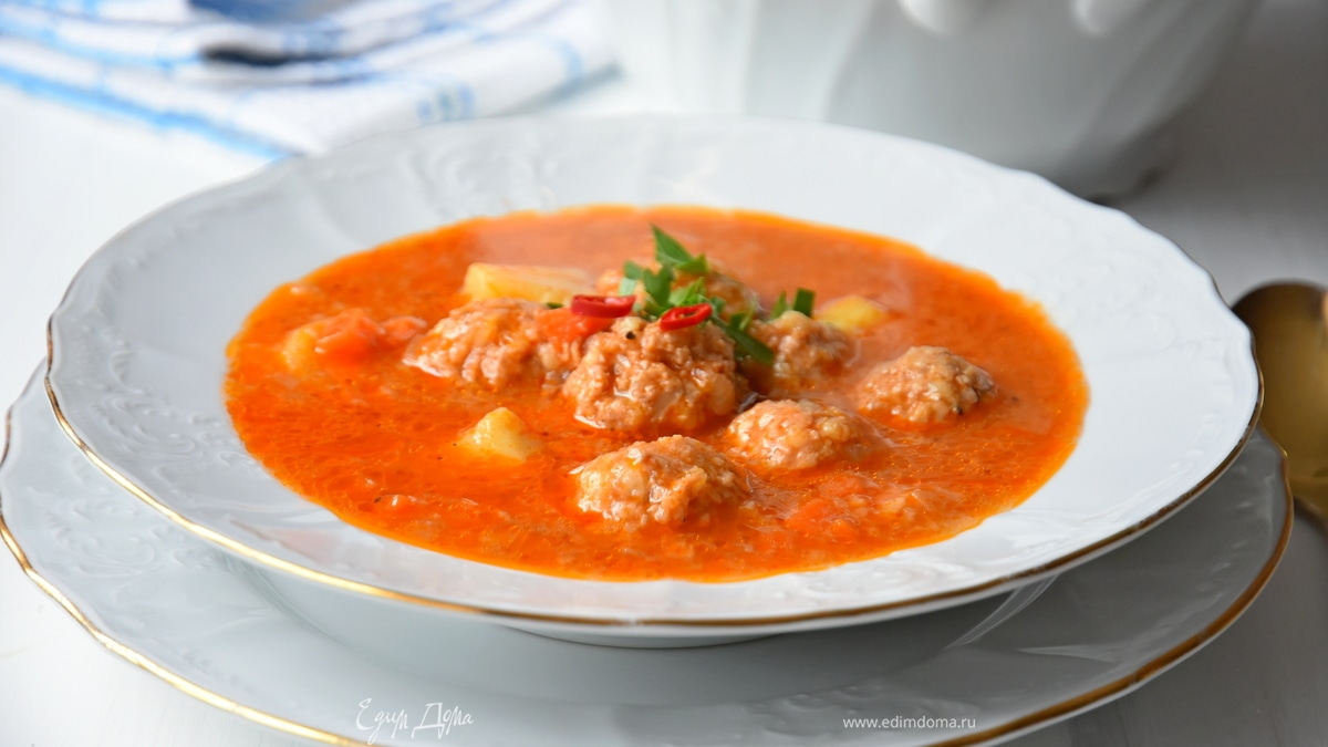 Нам очень пришлась по душе национальная турецкая кухня. Может потому, что турки предпочитают домашнюю традиционную еду быстрому европейскому фастфуду. А ведь соблюдение семейных традиций, прием пищи за общим столом и являются основой семейной идиллии и теплых отношений. Насыщенный ароматный и густой турецкий томатный суп с фрикадельками разнообразит семейное меню.