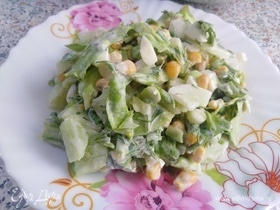 Собираем салат: все составляющие кладем в миску, добавляем нарезанное кубиками сладкое сочное яблоко (несколько долек), консервированную кукурузу ТМ «Фрау Марта», рвем руками пучок свежего салата. Добавляем в салат по вкусу соль и заправку — майонез, йогурт, сметану. - Шаг 6