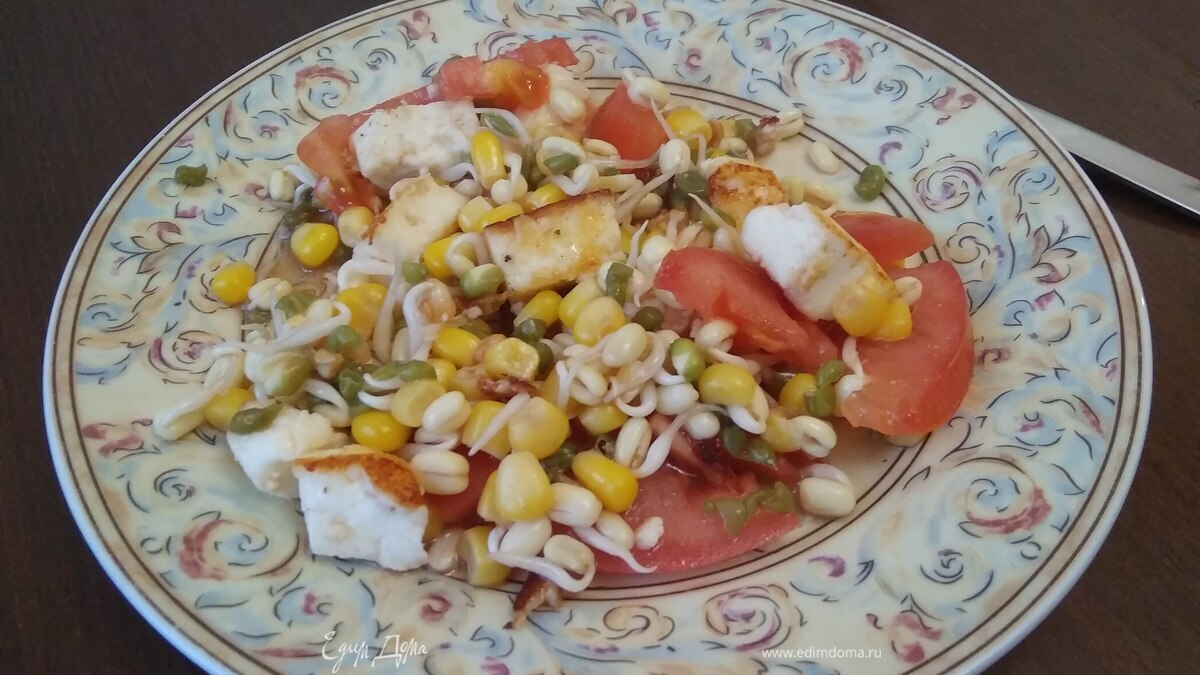 Салат из ростков маша, помидоров и жареного сыра