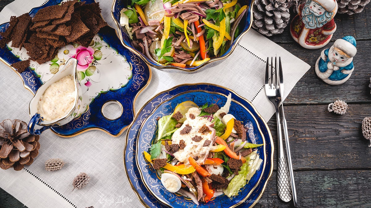 Ломаете голову, что приготовить на новогодний стол, помимо привычных оливье и сельди под шубой? Приготовьте салат из телятины с овощами и ржаными сухариками. А изысканная посуда