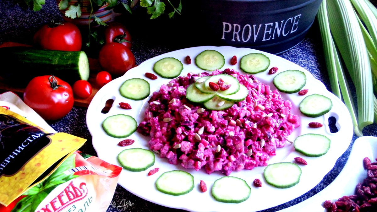 Приятные и любимые многими сочетания: селедочка и свекла у каждого на столе в Новый год. Дополним салат свежими сочными овощами: сельдерей и огурец, а сбалансирует и объединит их нежный творог и классическая майонезная заправка от ТМ «Махеевъ». Желательно дать постоять салату в холодильнике.