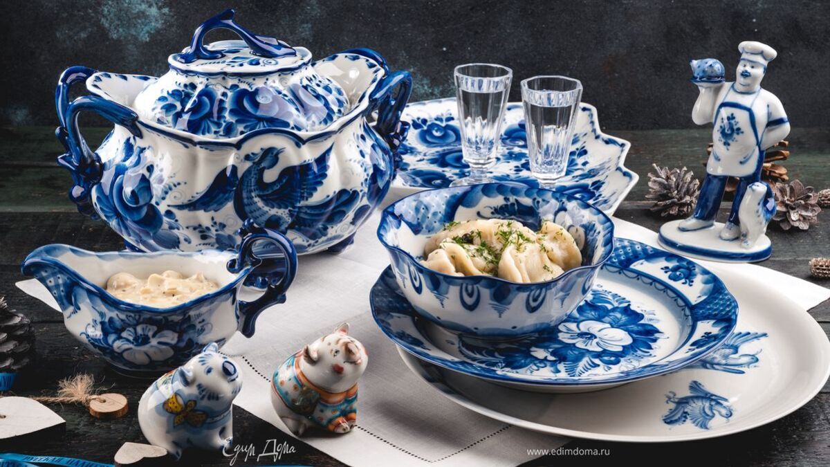 Готовые пельмени посыпьте свежим укропом.Украсьте стол салфеткой «Крестецкая строчка». Подавайте пельмени и соус в наборе посуды из гжельского фарфора, представленной в бутике интерьерных решений «РУССКАЯ ПАЛИТРА». К таким пельменям можно подать крепкий напиток в хрустальных лафитниках «Гусевского хрустального завода им. Мальцова». Приятного аппетита!