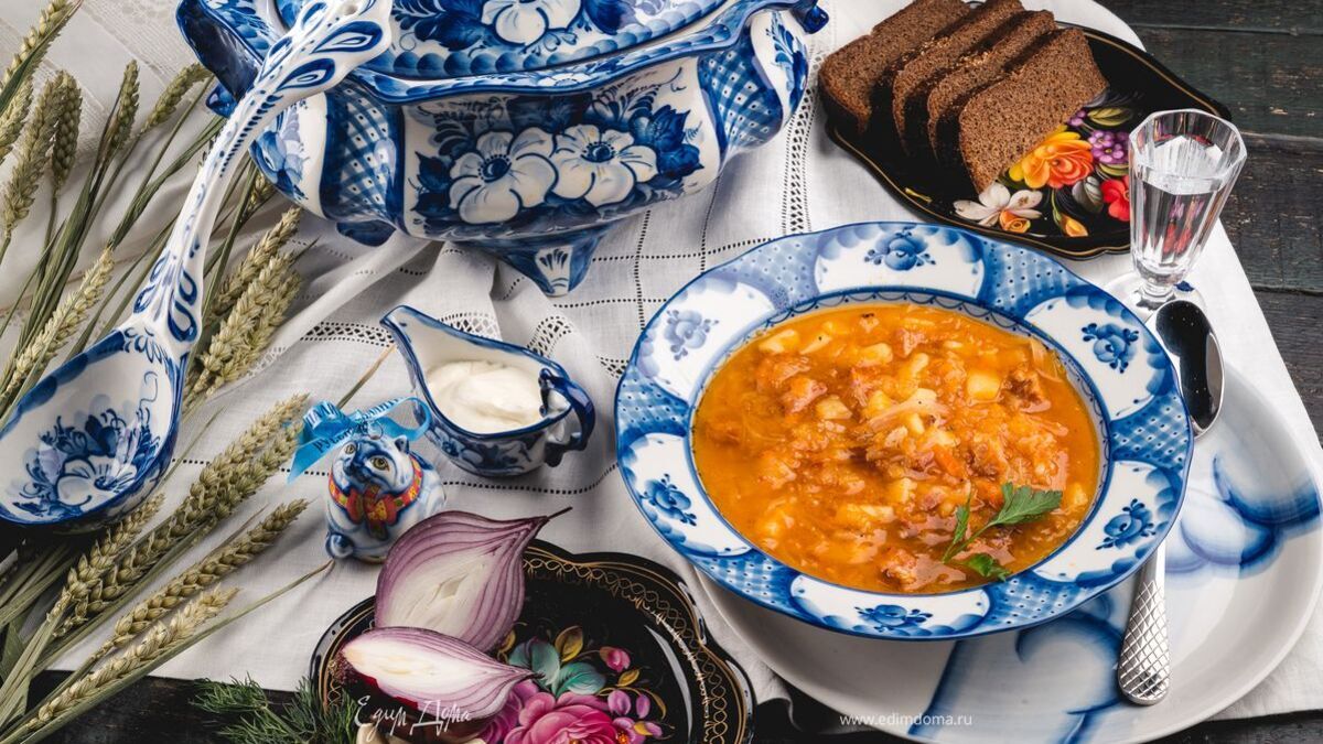 Украсьте стол салфеткой «Крестецкая строчка». Для подачи хлеба прекрасно подойдет жостовский поднос. Сами щи подавайте со свежей зеленью и сметаной в сервизе из гжельского фарфора, представленном в бутике интерьерных решений «РУССКАЯ ПАЛИТРА». Приятного аппетита!