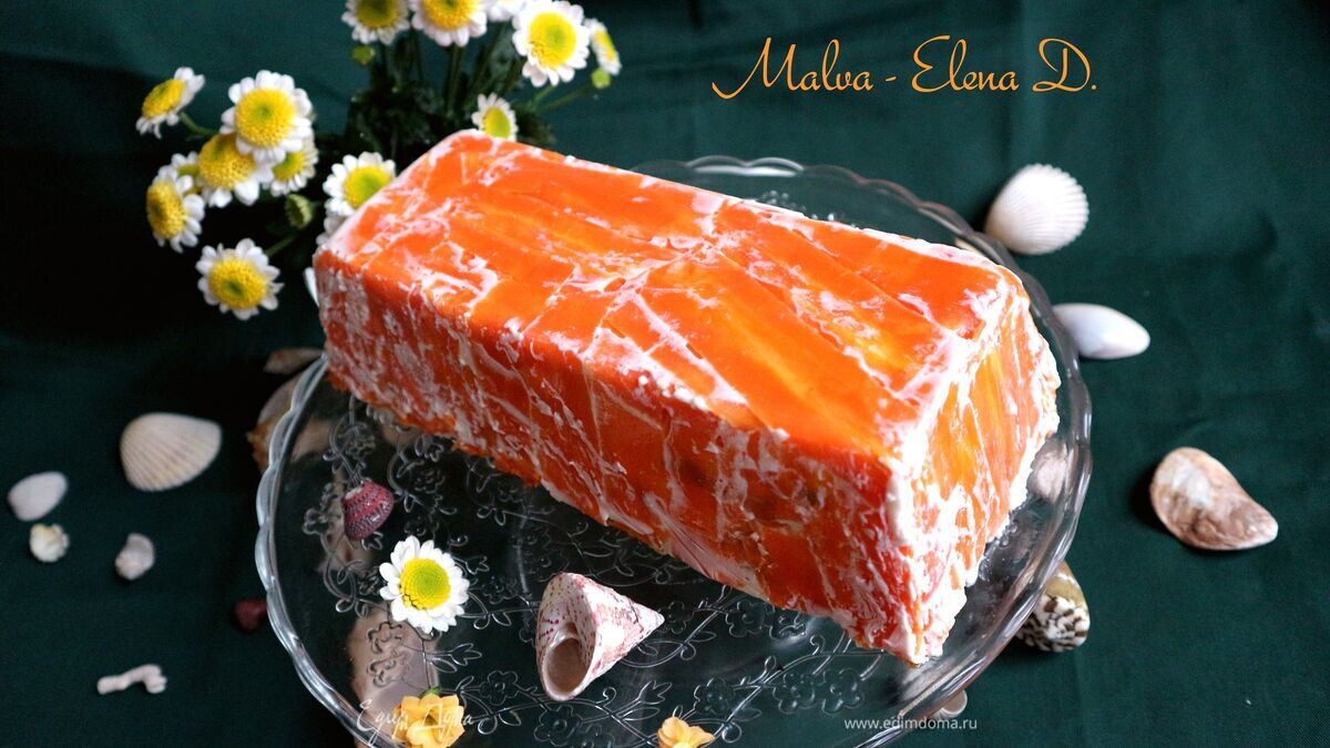 Перед вами один из рыбных терринов, состоящий из нежной трески, яркой по вкусу и цвету малосольной форели и диких креветок. Все продукты подвергались очень щадящей обработке, в результате получилось нежнейшее блюдо, по консистенции похожее на паштет. «Одет» террин в тонкий оранжевый «морковный наряд», который позволяет ему выглядеть весьма эффектно. Проступающие на внешний слой желированные с рыбным бульоном сливки создают мраморность. Меня в приготовлении террина привлекает, прежде всего, возможность импровизировать. Он вполне подойдет для того, чтобы стать украшением праздничного стола.