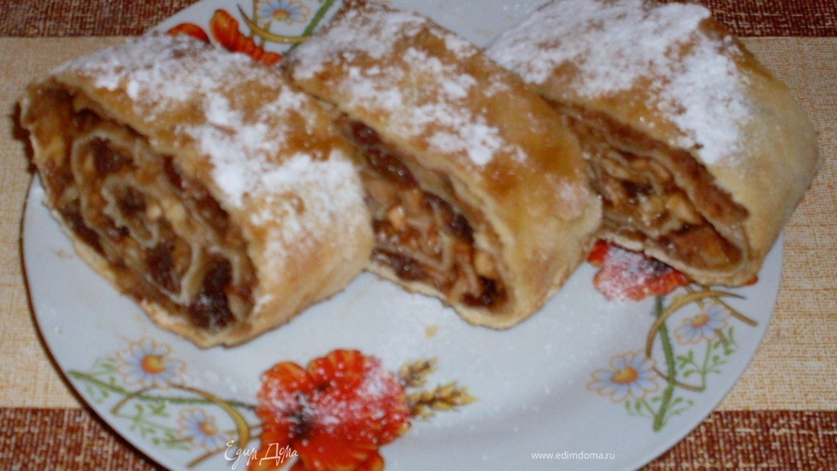 - Шаг 1Для теста муку просейте, добавьте яйцо, масло, соль, 1/2 стакана воды с добавлением капли уксуса и замесите тесто. Смажьте его маслом, оберните пищевой пленкой и охладите. Яблоки нарежьте маленькими кубиками, посыпьте сахаром, корицей, соедините с изюмом, измельченными орехами и коньяком. Белый батон обжарьте на сухой сковороде до золотистого цвета и высушите на едва заметном огне.Измельчите в ступке. Тесто раскатайте в тонкий пласт, сбрызните его лимонным соком, посыпьте сухарями, выложите яблочную начинку, сверните рулетом, концы рулета заверните вовнутрь, чтобы начинка не вытекала. Верх рулета смазать сливочным маслом. Рулет уложите на противень и выпекайте при умеренной температуре до золотистого цвета минут 30. При подаче теплый штрудель разрежьте на порции, уложите на блюдо, посыпьте сахарной пудрой.