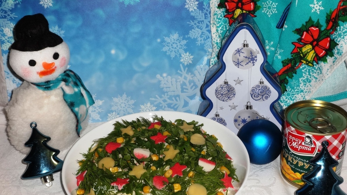 В преддверии наступающих праздников хозяйки заняты подбором блюд для новогоднего стола. Предлагаю вашему вниманию рецепт несложного в приготовлении и очень вкусного салата. Рецепт можно взять за основу, а украсить по вашему желанию. В состав моего салата входит очень вкусная сладкая кукуруза ТМ «Фрау Марта». Готовьте и угощайтесь!