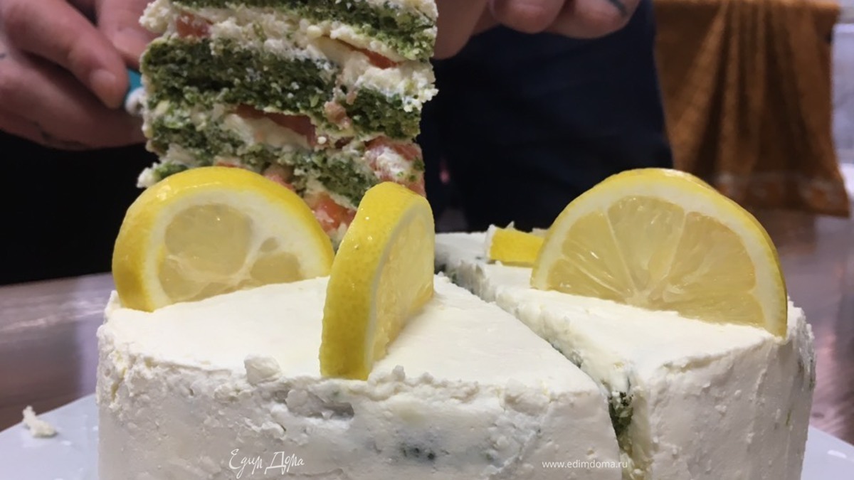 Мне нравится, когда закуска выглядит красиво, — это всегда украшение стола. Шпинатный торт как раз из разряда таких блюд. Изумрудный цвет в сочетании с ярко-красным создают буйство красок на вашем столе и радуют глаз. По вкусу все продукты хорошо сочетаются: нежный бисквит на основе шпината, сливочно-сырный крем с легкой кислинкой лимона и соленая рыба. Рыбу вполне использовать любую, которая есть в наличии — семгу, форель и т. д. Радуйте себя и гостей вкусными необычными блюдами!